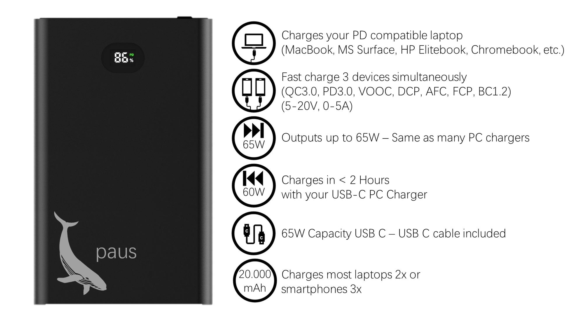 Take a deep breath and relax, the paus laptop power bank was born to enable a life of working from where you feel inspired. Don’t stay tethered to the wall when your battery is running out, take that sweet spot on the beach, in the forest, on the ski-track, or on the balcony instead.